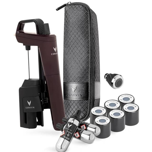 3 stk Coravin patroner som tillader dig at hælde op til 45 glas á 150 ml, bæretaske så du kan tage din Coravin med på farten, kit til rengøring af nål, flaske hylster og en Coravin Aerator.
