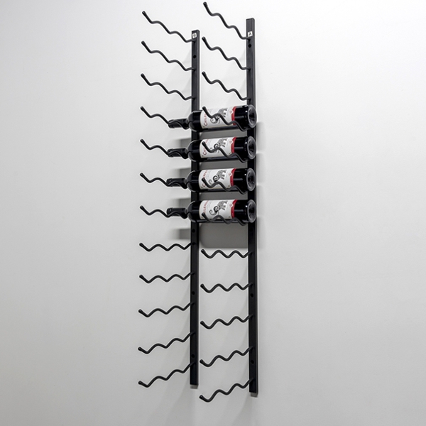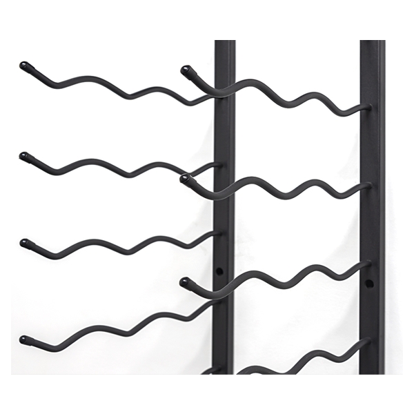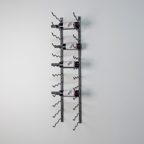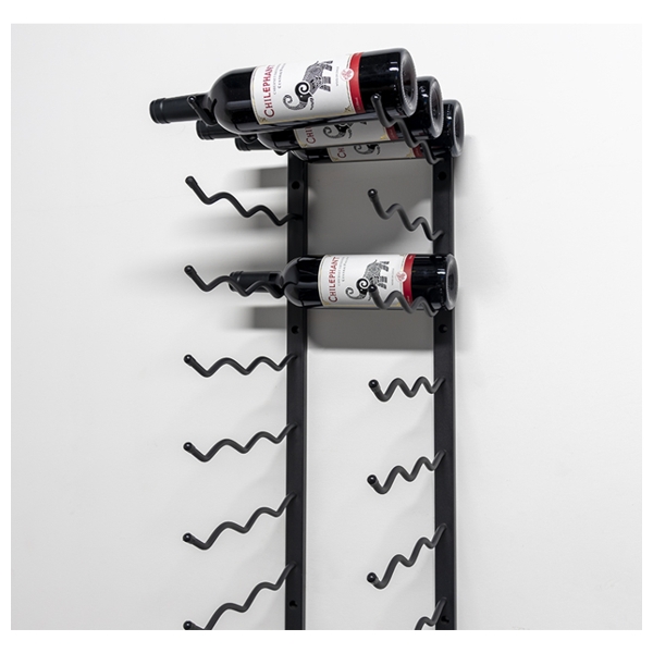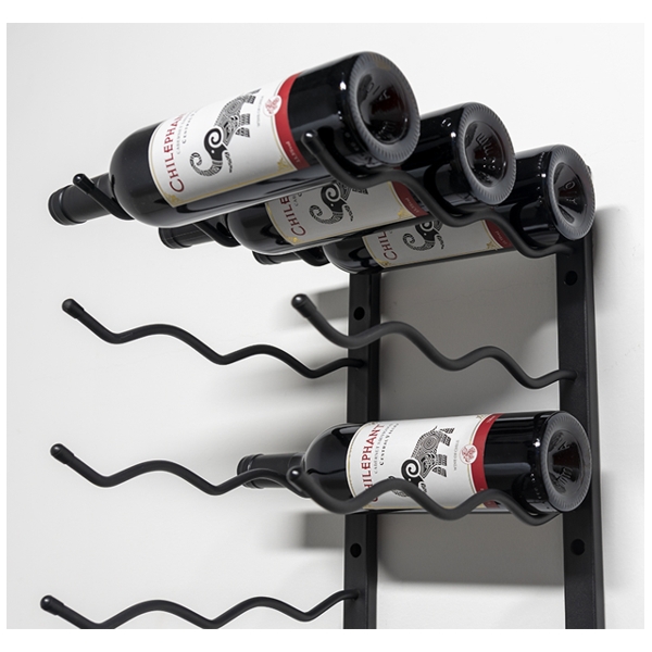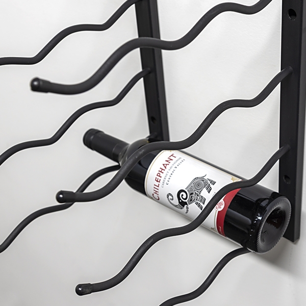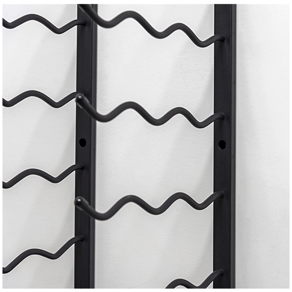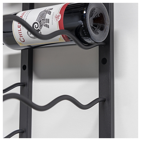 Den solide vægmontering og de specialdesignede stål-arme sikrer, at flaskerne hænger stabilt og sikkert, samtidig med at reolen skaber en flot visuel effekt, der kan løfte ethvert rum – fra vinkælderen til køkkenet eller stuen.