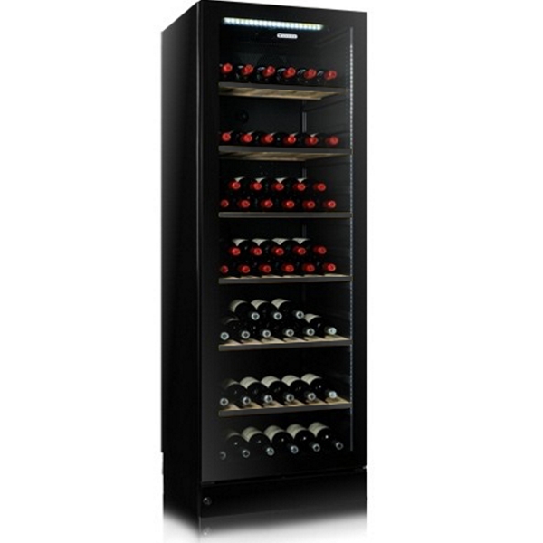 Vintec Noir V190 SG 2e BK Vinskab med glasdør og sort kabinet. Vinskabet har plads til 140/194 flasker. (De 194 flasker er maksimum ved høj udnyttelse af skabets kapacitet, hvor flaskerne er stablet med to kolonner i dybden og de ligger forskudt – hals mod hals, idet hver andet lag er placeret modsat). Der medfølger 6 stk. multifunktionshylder og 1 stk. displayhylde i vinskabet. . Vintec “BK” modellen er udstyret med fuldglas dør og LED lines i hver side af døren. Vinskabets kabinet er glanssort og en indfarvning i termoruden hele vejen rundt, giver illusionen af en højglanssort dørramme. LED belysningen af vinskabets ædle indhold er uovertruffen – i kraft af linearmaturer i begge sider og desuden i toppen af vinskabet. Mål i cm: H: 185 B: 59,5 D: 60.